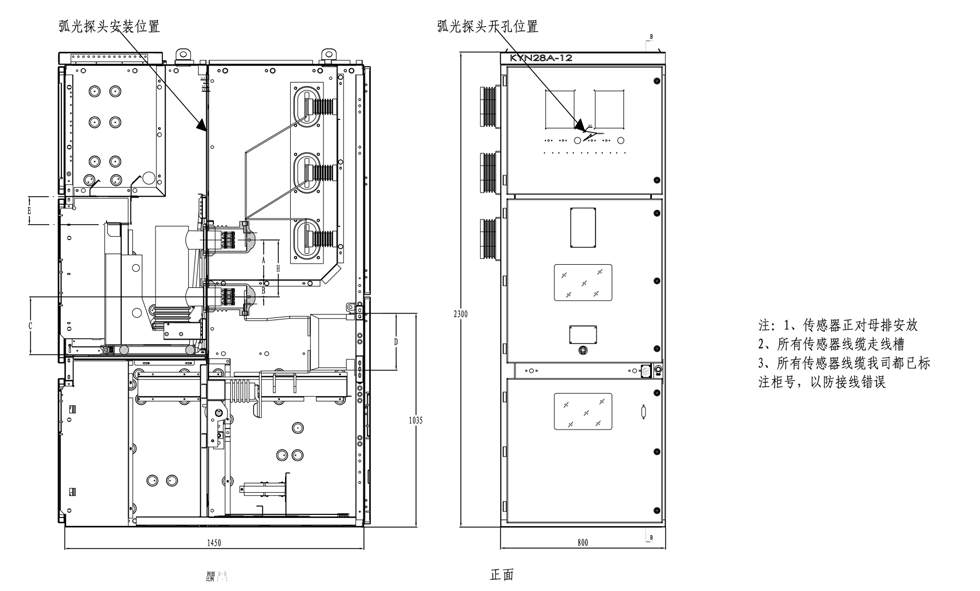 (4)、弧光传感器应安装于开关柜里需要保护的区域。传感器正对对准被保护对象。